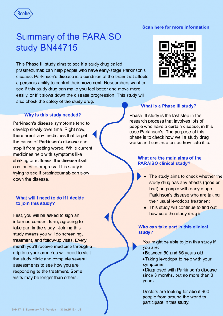 Paraiso is study to compare prasinezumab with a placebo in people with early-stage Parkinson’s disease who are taking levodopa to manage their disease symptomsParkinson’s disease (PD) is a long-term condition that gets worse over time. In PD, a naturally occurring protein called alpha-synuclein does not form properly. It sticks together to form clumps. This damages nerve cells in certain areas of the brain and causes nerve cells to die. Current treatments relieve symptoms but do not reverse, slow down or stop brain cells from dying. New medicines are needed that can prevent brain cell death to stop or slow the speed at which PD gets worse. This study is testing a medicine called prasinezumab. It is being developed to slow down the progression of PD symptoms. Prasinezumab is an experimental medicine. This means the U.S. Food and Drug Administration has not approved prasinezumab for the treatment of PD. This study aims to compare the effects of prasinezumab against non-active medicine (placebo) in people with PD who are taking levodopa to manage their symptoms.