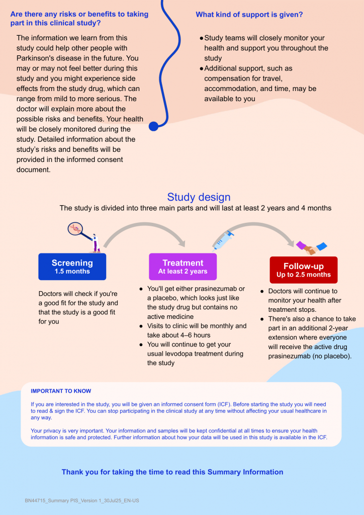 People will be screened to check if they are able to participate in the study. This is a ‘placebo-controlled’ study. This means that participants are put in a group that will receive a medicine or in a group that will receive ‘placebo’ (a medicine that contains no active ingredients but looks the same as the study medicine). Everyone who joins this study will join 1 of 2 groups randomly (like flipping a coin) and given either Prasinezumab, given as a drip into the vein (infusion) every 4 weeks OR placebo, given as an infusion every 4 weeks. Once participants have completed the double-blinded part of the study they may choose to continue to receive treatment in an extension of the trial. Everyone who joins the extension will be given prasinezumab as an infusion every 4 weeks. The extension is open-label which means everyone involved, including the participant and the study doctor, will know the participant has been given prasinezumab. Total time of participation in the study will likely be between 2 and about 3.5 years depending on when they join. Participants have the right to stop study treatment and leave the study at any time, if they wish to do so.